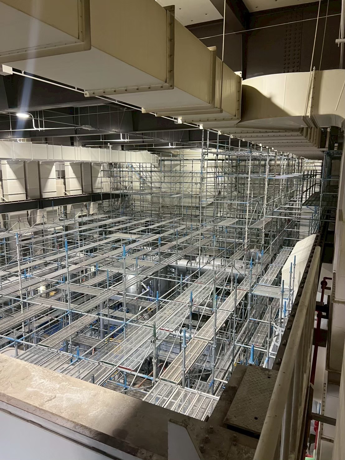 外壁改修やメンテナンス作業に必要な足場を構築いたします。既存施設内での工事となるため、鳶職による専門的で慎重な足場設置を実現いたします。